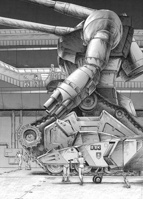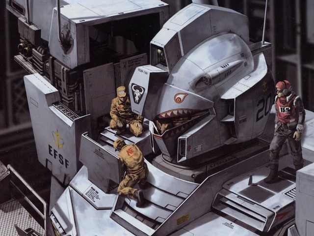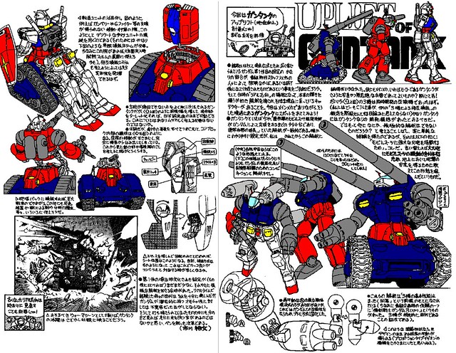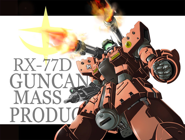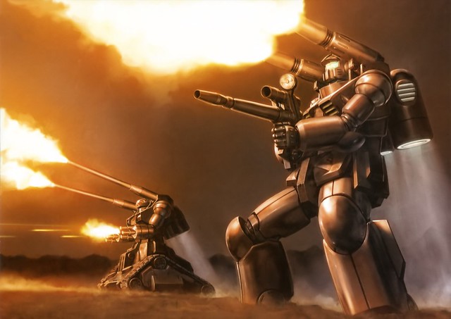 鋼坦克RX-75 Guntank,正是這種大砲病毒浪漫病還沒有被治好的症狀之一。半人型移動砲台及履帶戰車式設計為主要特徵,雙肩各裝備了120mm低後座力火藥式加農砲,腕部則裝了40mm四連裝榴彈發射器,做為長距離火力支援,在戰場上躲得遠遠的,我打得到你,你打不到我很歡樂,可是一旦距離拉近,就被對方痛宰了。
