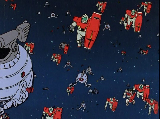 如前所述,在MS正式登場前,連邦軍的戰術主要是採取「大砲巨艦主義」,在宇宙中就是薩拉米斯級、麥哲倫級等新型宇宙艦艇,在陸地上則以61式戰車為主力,總之,就是利用火力強大的兵器來壓制對方。然而,因為「米諾夫斯基粒子」這種能夠遮敝電訊通信的技術誕生,讓所有偵測與定距的工具幾乎完全失靈,看不到,瞄不準,火力再強大也沒有用,當然也就被吉翁軍最先進的MS當成靶機來打。