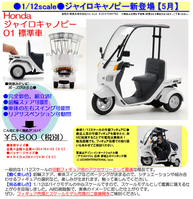 玩具新聞 日系 模型 1/12 HONDA Gyro Canopy 模型車 奶油隊長 2014-02-14 15:33:55 分享 ✕ 分享 已複製網址 分享到 Facebook 分享到 LINE 分享到 Reddit 分享到 Twitter 分享到 Plurk 分享到微博 日TOMYTEC公司預計2014年5月發行1/12 ジャイロキャノピー 01標準車,以1/12比例的 HONDA Gyro Canopy 模型車(暫時翻譯)需要自行簡易組裝不需要上色,可以讓喜歡可動 6吋高度action figure可以共同使用,組裝起來的尺寸長度約16公分、高度約14.3公分,售價約5,800元日幣,推薦給喜歡1/12比例action figure的玩具人參考。 奶油隊長 沈迷收集玩具、嗜好設計玩具、熱愛視覺圖像的思考模式,同時也超愛吃各種口味的美式漢堡,希望可以一直玩玩家到 100 歲。