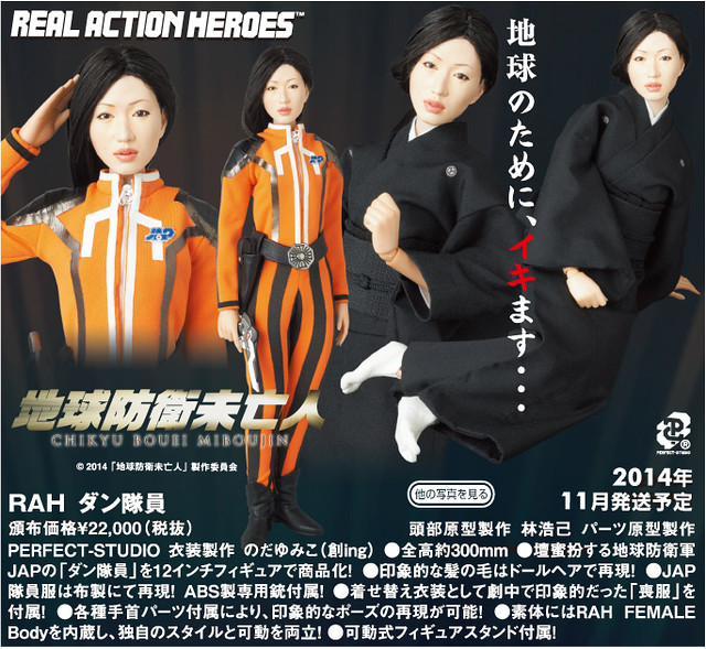 日MEDICOM玩具公司的RAH系列預計在2014年11月發行地球防衛未亡人 ダン隊員,由壇蜜飾演的特攝片『地球防衛未亡人』是《日本以外全部沉沒》導演河崎實所執導拍攝的,故事描述在結婚前夕由 壇蜜所飾演的地球防衛隊 壇隊員(暫時翻譯譯)(ダン隊員)其未婚夫被怪獸殺害,為此壇隊員為了復仇,駕駛戰鬥機與怪獸對抗的特攝電影,不過預告片內容是壇隊員脫光衣服和怪獸戰鬥?有興趣的玩具人可以參考一下下方影片連結。