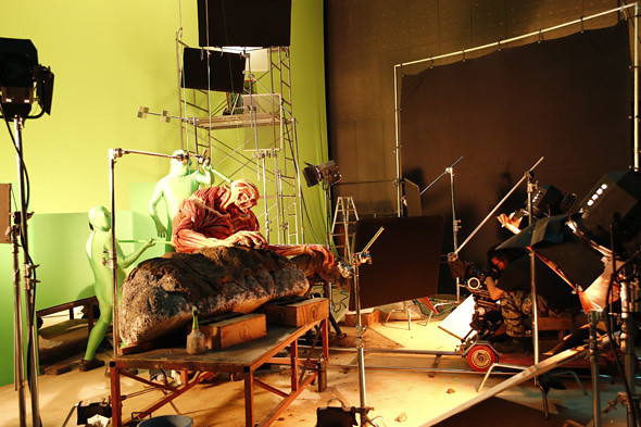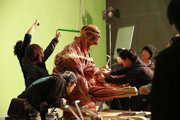 影片中,筋肉爆發、充滿強烈魄力的超大型巨人,是使用花費1個月時間製作的巨大模型,為了要操控這一個道具,必需使用到7個人來控制各個部位。除此之外,影片中的岩石、蒸汽不使用CG,全部使用實物拍攝,而巨人的臉部造型、傷疤使用的全是真人,利用逼真的特殊化妝來呈現!樋口真嗣導演真是太厲害了,相當期待電影的完成啊!~