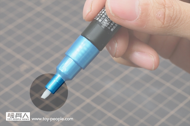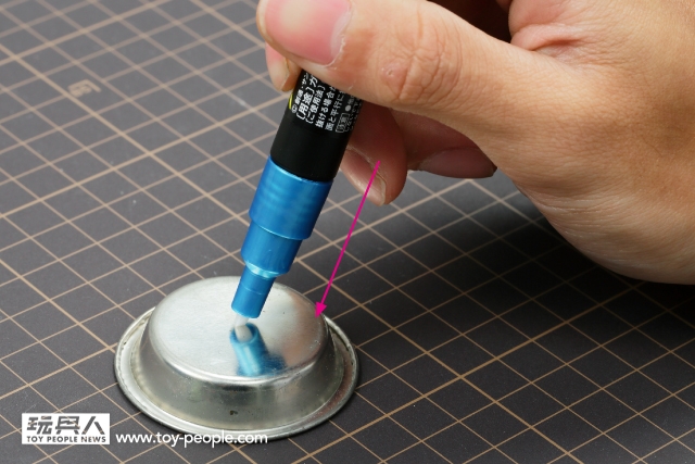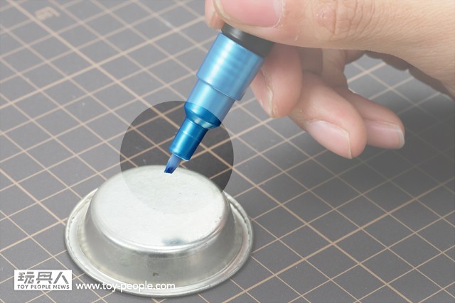 ▼ 開始使用前,請先上下搖晃,會出現"喀喀"聲響,是因為鋼彈麥克筆的筆桿內有鋼珠,是為了使漆料達到更均勻的融和。接著找一個塗料皿的背面,將筆頭下壓約五秒,漆料會流到筆頭,即可停止。