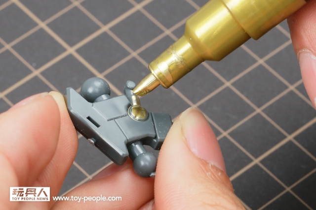 ▼ 使用金色的鋼彈麥克筆,將腰部骨架能原管線細心筆塗,稍微的塗出去是可以接受的!