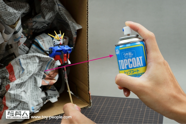 ▼ 噴保護漆的方式,點按並且平行移動噴罐,讓消光保護漆均勻的覆蓋在模型上。如圖所示,再噴漆過程要保持通風良好,可以使用紙箱加廢報紙,可以作為簡易噴漆箱,用來吸附多於粉塵,將低粉塵對環境的汙染。
