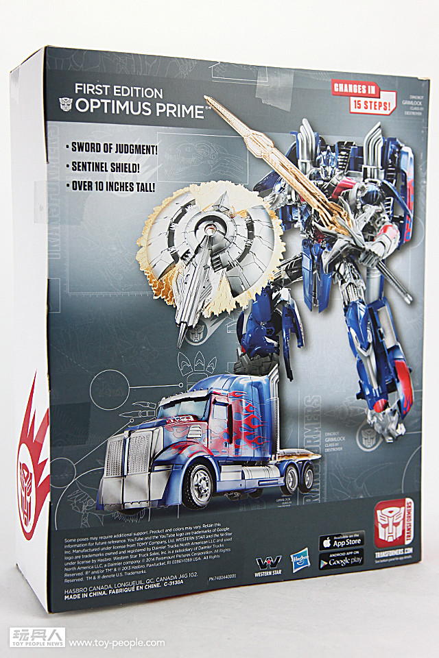 ▼ 包裝背面的說明,本作除了能夠精彩的變形為載具模式之外,搭配了審判之劍(Judgement Sword)與御天盾(Sentinel Shield) 也是一大賣點!
