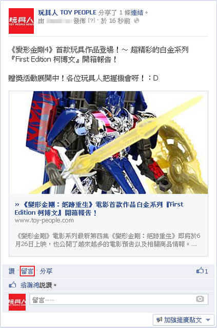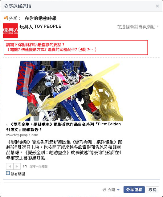 1. 到本次的「《變形金剛:絕跡重生》電影首款作品白金系列『First Edition 柯博文』開箱報告!」開箱報告文章按“讚”,並分享至你的塗鴉牆上,分享時寫下你覺得『First Edition 柯博文』最大賣點是什麼? 只寫“已分享”是鐵定不會中獎的喔!