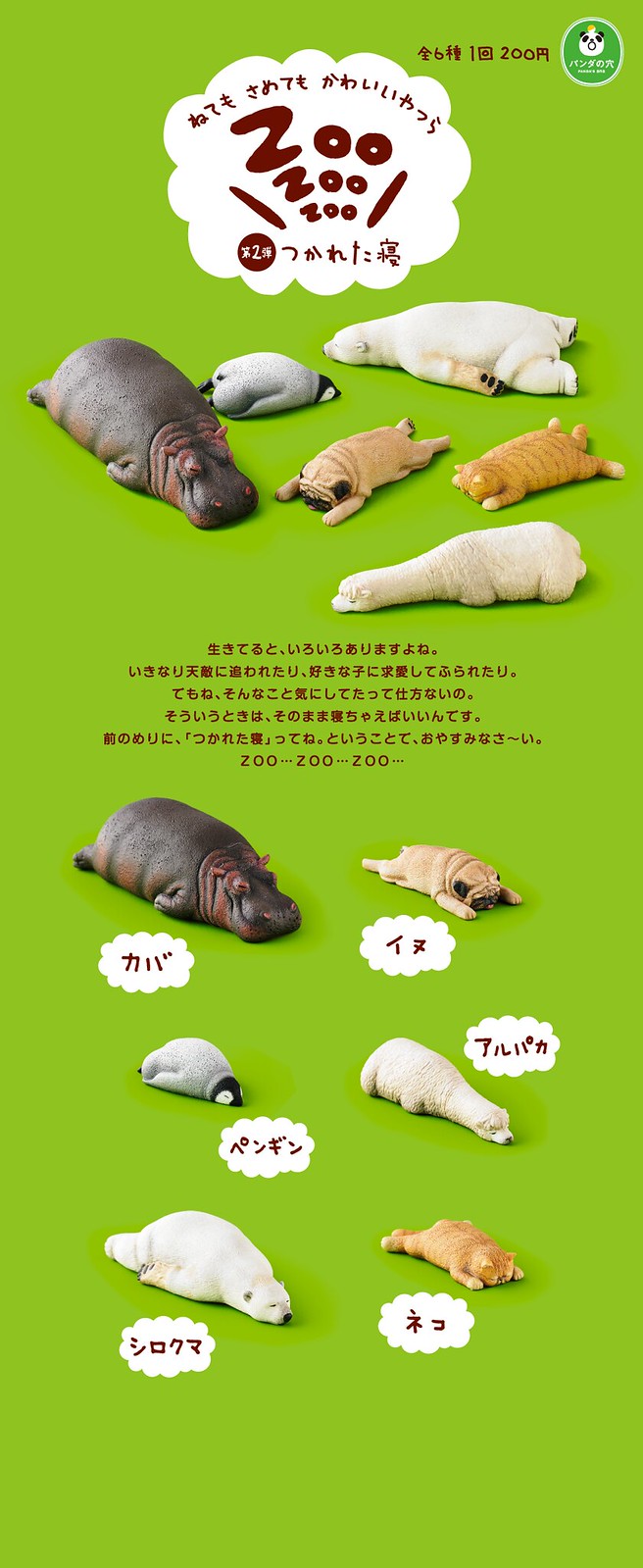 日TAKARA TOMY 玩具公司的可愛系列パンダの穴(熊貓之穴)轉蛋商品,在第一彈的「ZooZooZoo」睡覺的動物園(暫時翻譯)大受歡迎後預計接著推出其第二彈,這次的動物收錄了北極熊、企鵝、巴哥犬、河馬和草尼馬等等六款可愛的動物以他們睡覺的模樣呈現,每款動物睡著的模樣相當有趣味,看了十足的撫慰人心啊~ 喜歡動物的玩具人千萬別錯過了喔!