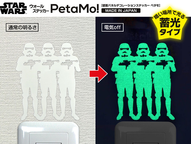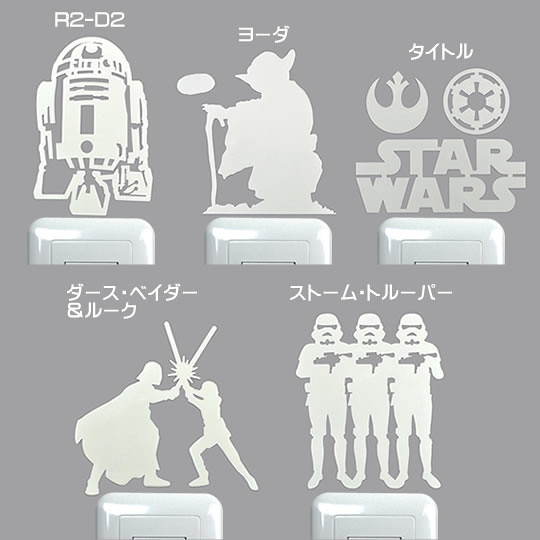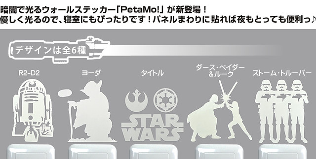星戰迷一定不能錯過現在我們為您推薦的夜光貼紙!本商品推出了各種經典星戰圖案,包括了白兵、STAR WARS標題、尤達大師、R2D2及父子對決等主題,圖案酷、夜光炫,而且貼在插座附近可以便利晚間尋找,真是非常實用!每款日幣售價約840日圓(含稅),提供給大家參考!