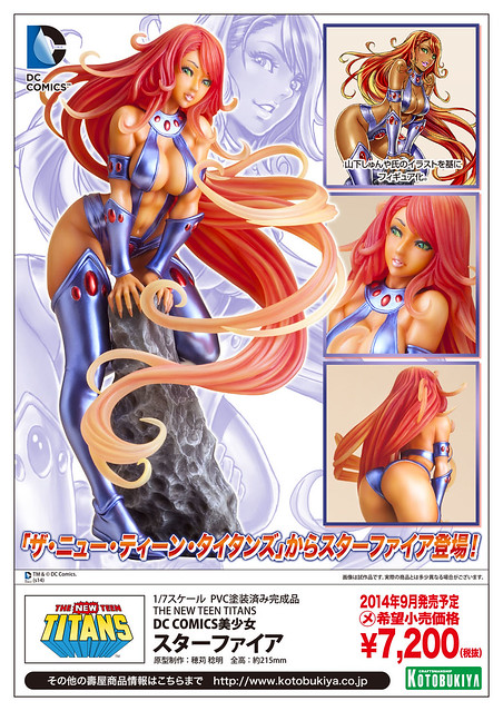 日Kotobukiya壽屋玩具公司的DC漫畫美少女系列預計2014年9月推出DC Comics Starfire Bishoujo Statue DC漫畫 星火 美少女雕像(暫時翻譯),來自DC美式漫畫英雄的女性角色人物由山下俊也繪製的美少女版本,在漫畫設定當中星火Starfire可以吸收紫外線輻射再轉化成攻擊性能源發射攻擊敵人,算是少數宇宙裡面的女性外星英雄角色,本身相當受到喜歡DC漫畫迷們的歡迎人,也曾經榮獲美漫前百大性感女性超級英雄中第二十二名。