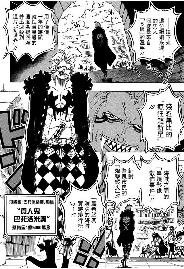懸賞1億5000萬貝里、被世間風為「最希望消失的海賊排行NO.1」的瘋狂超新星巴托洛米奧,是在「大事件」隔年後出道,以瘋狂殘忍的性格與手段,迅速成為世界矚目的對象。是超人系惡魔果實「屏障果實」(バリバリの実)能力者,只要擺出雙手的食、中指交叉的姿勢,就能在身邊形成一股屏障,能夠保護自己完全不受到任何外力傷害。