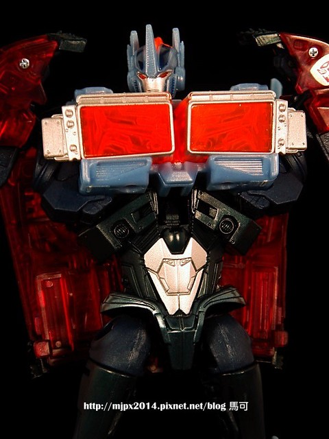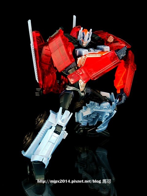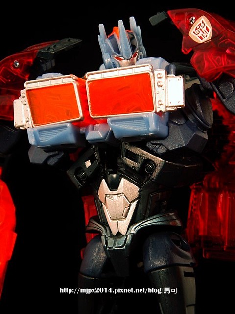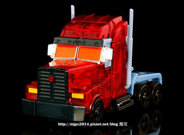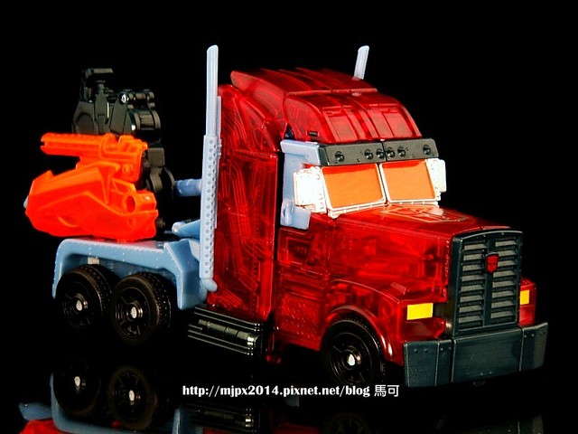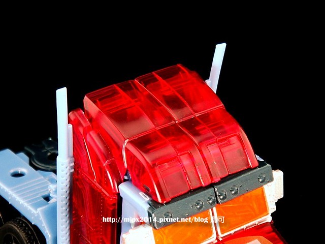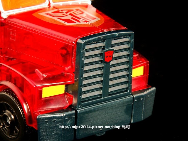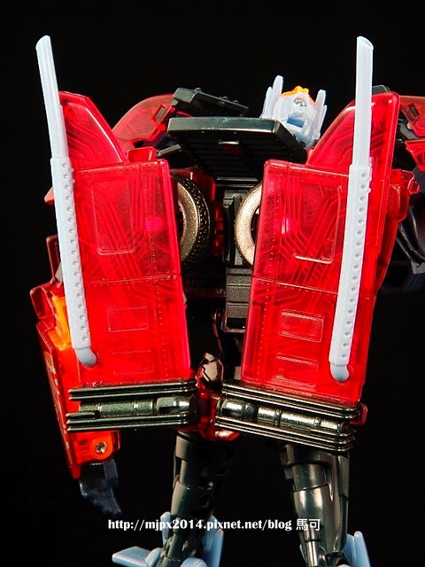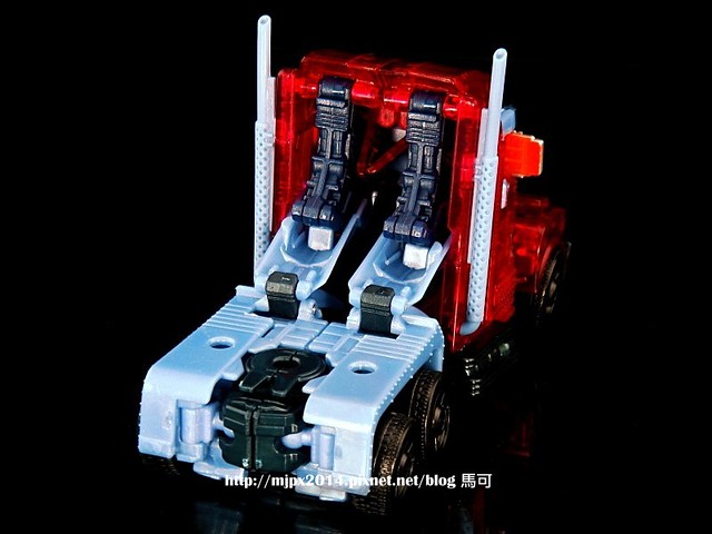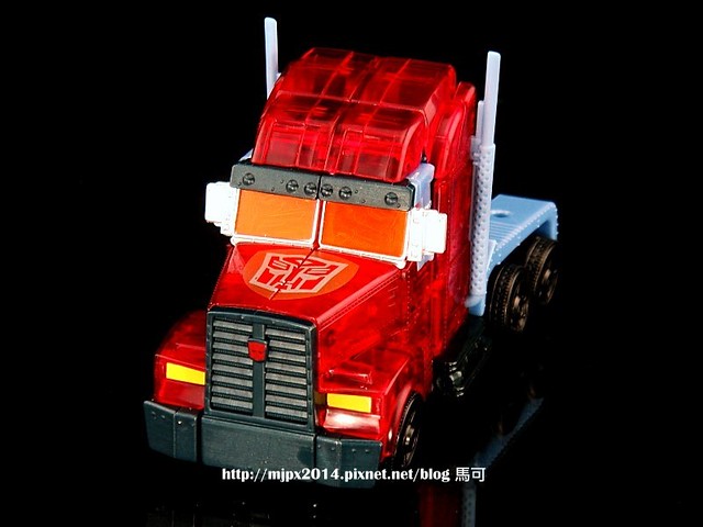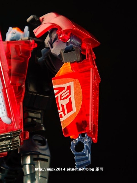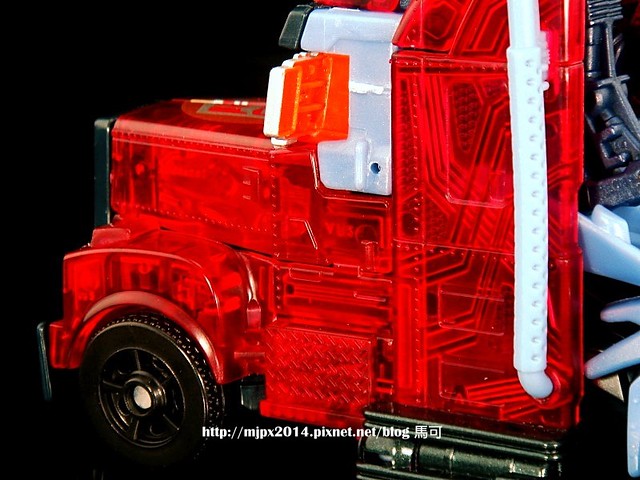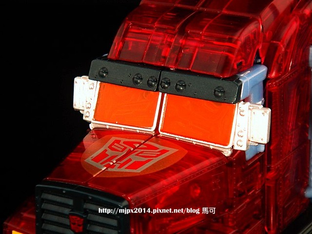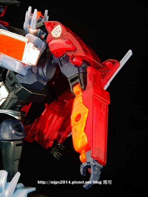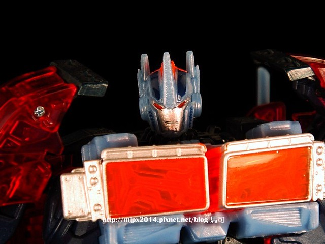 這款DARK ENERGON OPTIMUS PRIME(OP)全身採透明紅為主色,胸口(擋風玻璃)採透明橘設計,相當漂亮,但原本深藍配色處改為淺藍色卻淺的膠感十足。
