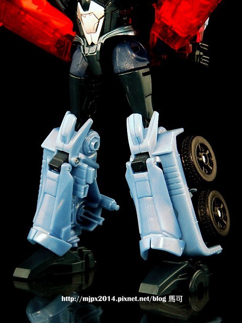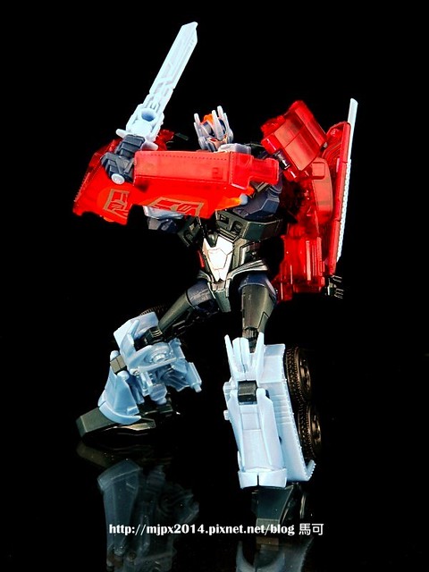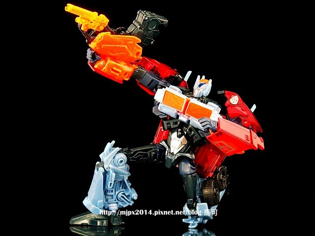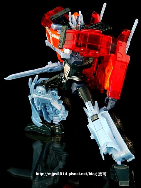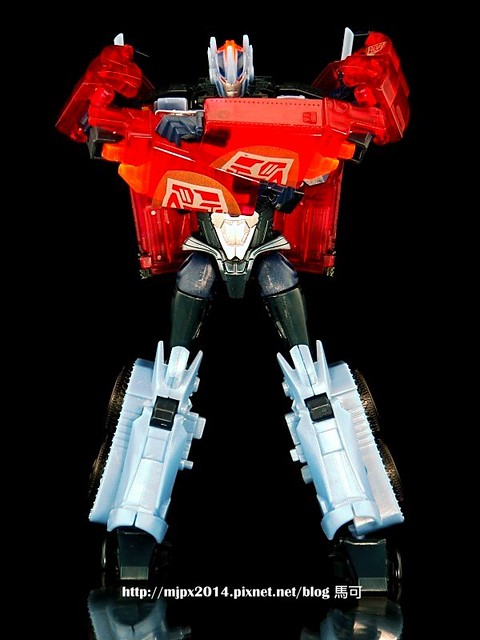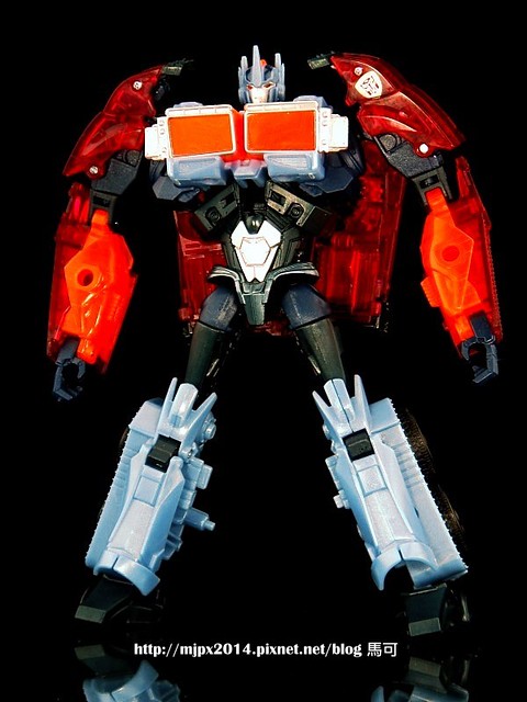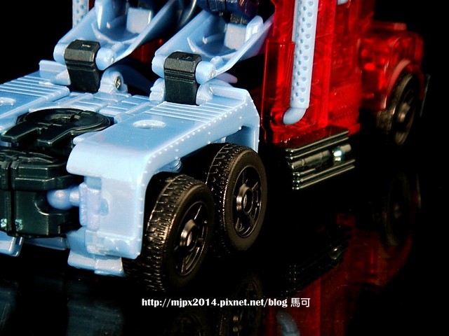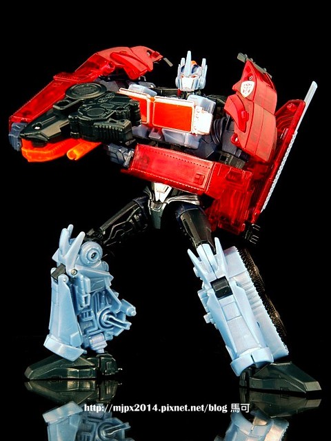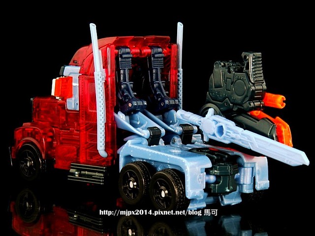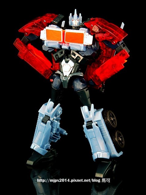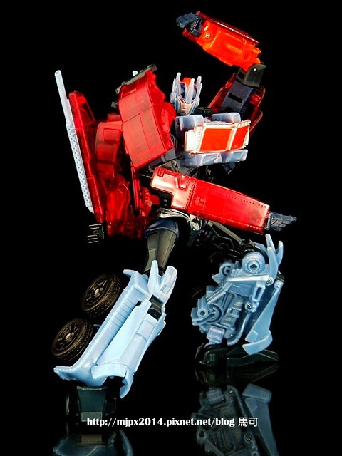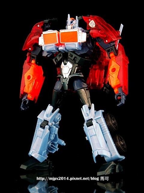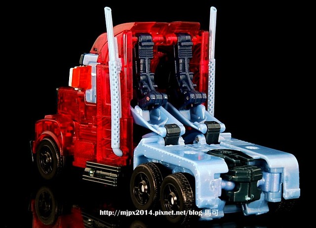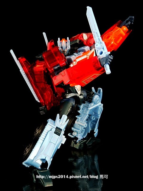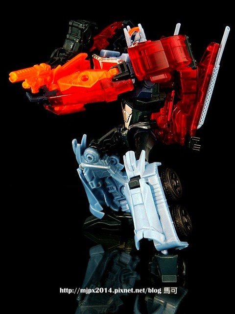 這款DARK ENERGON OPTIMUS PRIME(OP)全身採透明紅為主色,胸口(擋風玻璃)採透明橘設計,相當漂亮,但原本深藍配色處改為淺藍色卻淺的膠感十足。