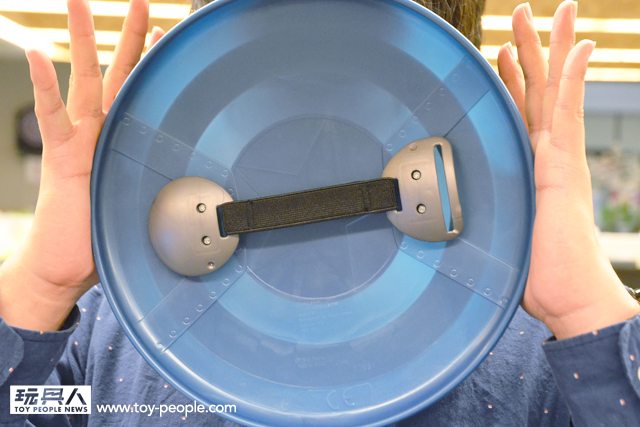 ▼ 飛翔盾牌的直徑約27 公分,輕巧、帥氣、比例適中,比臉略大之大人小孩都會愛,盾牌的背面有安全鬆緊帶,可套在手掌也可以當飛盤投擲,保護自己丟人兩相宜〔誤~〕。