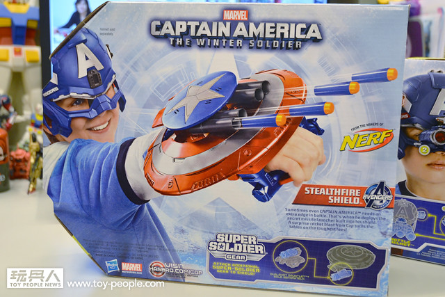 ▼ 首先!這次美國隊長系列玩具中最大尊的來也,孩之寶美國隊長2:酷寒戰士〔10 吋有聲美國隊長人偶〕與〔盾牌爆破摩托車組〕