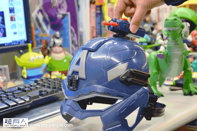 ▼ 緊接著,再把剛剛的雙鏡頭等配件加裝上去,變成兼具瞄準與射擊功能的武裝頭盔,直接透過眼前加裝的鏡頭配件有一種奇妙的3D 臨場感〔帶去電影院看電影,包準你登上水果日報今日我最靚〕,再順手握住握把,即可發射圓型飛鏢。