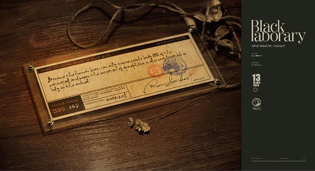 主角TOWE (BLACK LABORARY暗夜突擊組),與上一回暗夜偵察組同屬BLACK LABORARY的陸軍部隊。在服裝與裝備上,偵察組為騎兵裝搭配輕型武器。而突擊組為單兵作戰裝搭配中型戰鬥裝備。BLACK LABORARY暗夜突擊組是BLACK 13 PARK人偶造型創作技術,與藝術感悟的成熟階段作品,人偶設計中的每一個細節,都是我們用心思索與嚴謹設計的體現。
