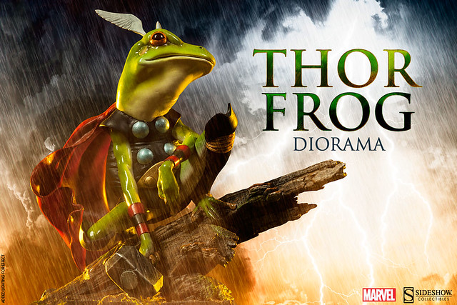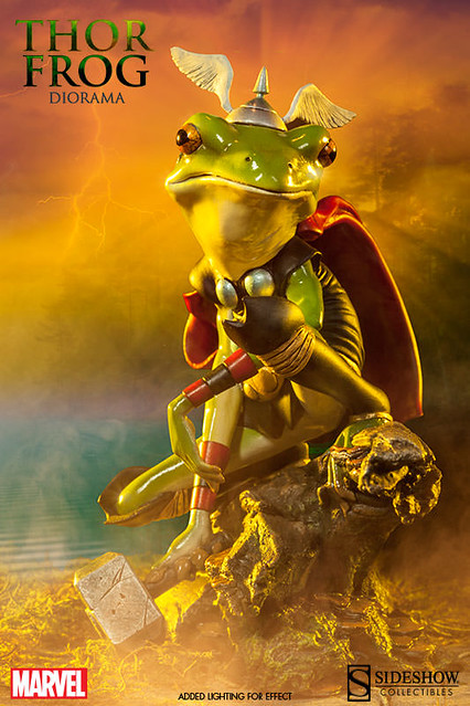 在驚奇漫畫與卡通版本裡曾經出現過雷神索爾被變成青蛙的橋段,但即使如此,只要手持雷神之鎚索爾依舊是無人能敵啊!先前我們曾介紹過Gentle Giant推出的版本,但近日SIDESHOW推出的雕像更是另一次元檔次喔!(價格估計也是...)在本次推出作品裡,索爾青蛙的造型更加栩栩如生,光滑明亮的外皮以及生動的曲線,彷彿真有索爾青蛙降臨現世。另外雷神之鎚以及樹幹地台的質感也非常逼真,整體完成度相當優秀。售價約99.99美元,預計2014年10月推出提供大家參考!!