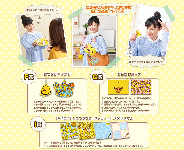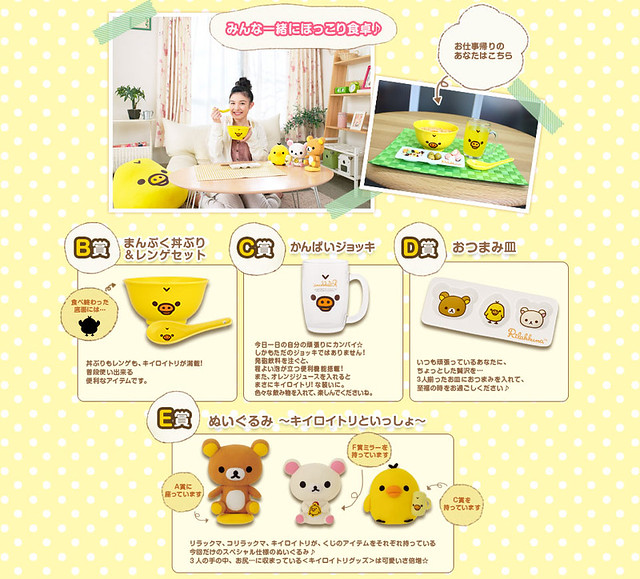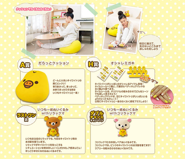 A賞是以拉拉熊最愛的黃色坐墊作為概念,所設計出的超大、超舒適黃色小雞坐墊。B~D 賞以丼飯碗公與湯匙組合、啤酒杯、點心盤... 等,讓吃飯更加愉快的系列商品。除此之外,小包包、大手巾、可愛造型美甲工具以及可愛的絨毛娃娃...等的各式女孩小物,豐富豪華的內容絕對值得去抽一次呀!~