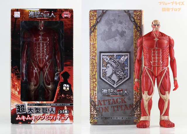 受到歡迎的動畫進撃の巨人持續推出其周邊商品,這次由FuRyu公司預計在2014年3月下旬推出進撃の巨人 超大型巨人ムキムキソフビフィギュア,進撃的巨人 超大型巨人 塘膠材質Figure(暫時翻譯)重現動畫當中出現的謎樣超大型巨人,尺寸約高21公分,在日本以景品方式販售,一抓約250元日幣,提供給喜歡進撃的巨人的玩具人參考。