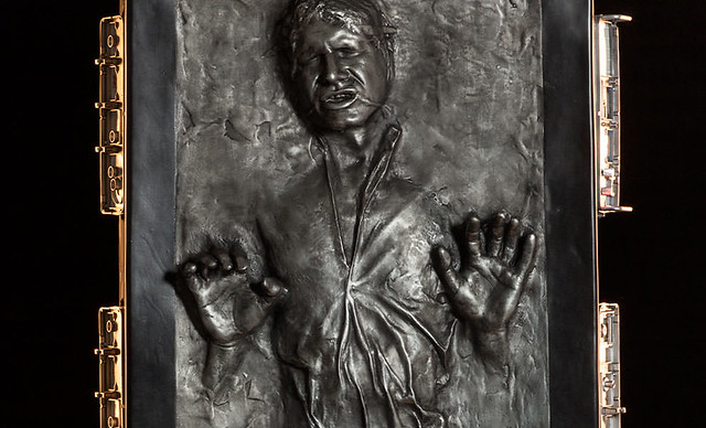 星際大戰五部曲:帝國大反擊中,最令人印象深刻的衝擊場景之一,就屬韓索羅遭遇了帝國的陷阱,被而碳化為炭結晶成為賈霸的戰利品。這衝擊性的模樣,多年來深受許多星際大戰粉絲所喜愛,市面上不斷地推出各種以碳化韓索羅為主題的商品,甚至在2012年迪士尼樂園的“星際大戰”週活動之中,還推出了個人專屬碳化服務的體驗活動。