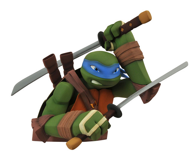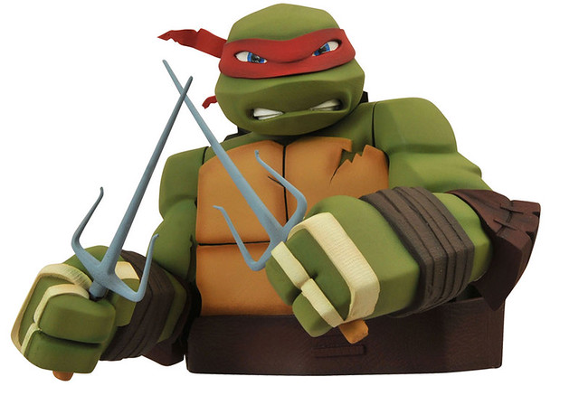 其中,在版權轉移到Nickelodeon 之後,所推出的第三部卡通作品,因具備了大量動作、喜劇元素,加上精美的CG 製作而獲得廣大的迴響,預計在2014年推出第三季。Diamond select 因應這股《忍者龜》風潮,推出了忍者龜角色胸像存錢筒,將四位忍者龜主角們生動的姿態與迷人氣質濃縮尺寸為約20公分左右。精美、生動的造型絕對是忍者龜粉絲們必定收藏的精彩傑作!