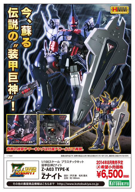 玩具新聞 日系 壽屋 壽屋 裝甲巨神 Z騎士 奶油隊長 2014-04-23 11:14:33 分享 ✕ 分享 已複製網址 分享到 Facebook 分享到 LINE 分享到 Reddit 分享到 Twitter 分享到 Plurk 分享到微博 日壽屋玩具公司預計2014年8月發行 HMM Series 1/100 Z・A03 TYPE-K Z Knight,1/100 比例模型的装甲巨神Zナイト Z騎士(暫時翻譯), 來自動畫裝甲巨神Zナイト當中人型最終兵器「装甲巨神」Z騎士這次以壽屋 HMM Series系列模型呈現,附多款故事出現的武器等等配件,組裝完成尺寸約18公分高,售價約6,500元日幣,提供給喜歡裝甲巨神Zナイト動畫的玩具人參考。 奶油隊長 沈迷收集玩具、嗜好設計玩具、熱愛視覺圖像的思考模式,同時也超愛吃各種口味的美式漢堡,希望可以一直玩玩家到 100 歲。