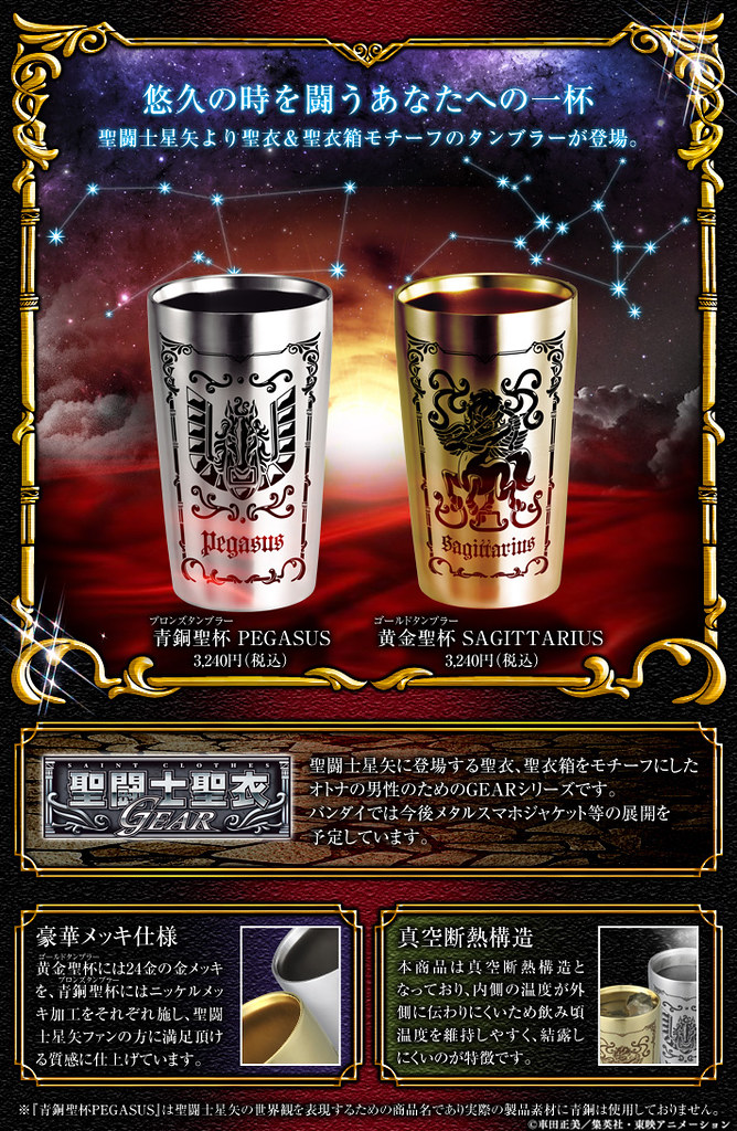 為悠久的戰鬥紀念,特別是上了年紀的漫畫迷,聖闘士星矢推出了青銅聖杯以及黃金聖杯兩款作品。分別以飛馬座及射手座為主題設計,造型質感十分精緻。並且採用了真空斷熱設計,不管冷飲、熱飲,都不會拿起來太冰或太燙喔!高14公分、最大直徑8.2公分,可容納約420ml的飲料,每款定價為3240日圓,預計7月出貨,提供給大家參考!
