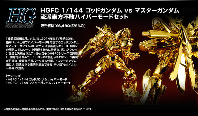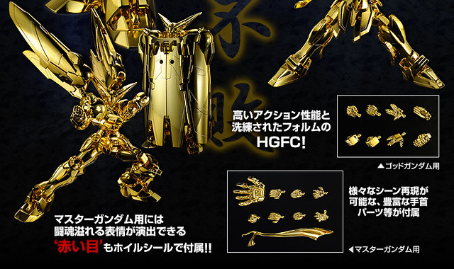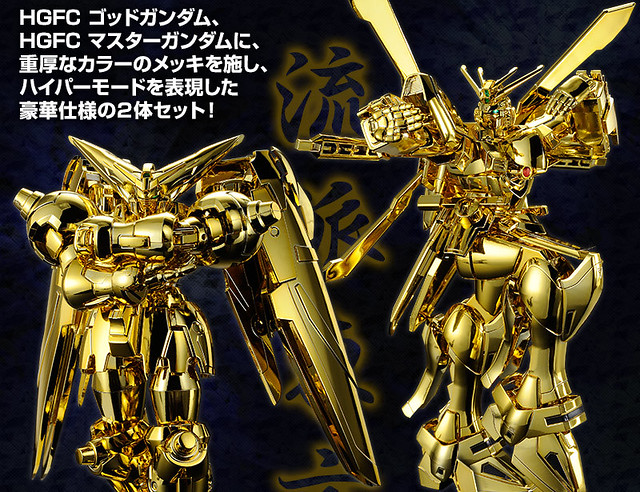 這一款豪華的套裝組合,收錄了主角多蒙‧卡修(ドモン‧カツシュ)與其師父東方不敗(真的是這個名字喔!XD)的師徒組合,重現了“神威鋼彈”(ゴッドガンダム)與“尊者鋼彈”(マスターガンダム)發動了“超級模式”(Hyper Mode)全身閃耀著金黃色光芒的對決組合。兩款機體完全使用金色電鍍製作,重現了流派東方不敗終極絕招的帥氣模樣;除此之外還附上了熱血、充滿鬥魂模樣的紅色眼睛貼紙。