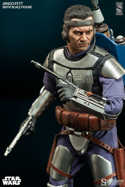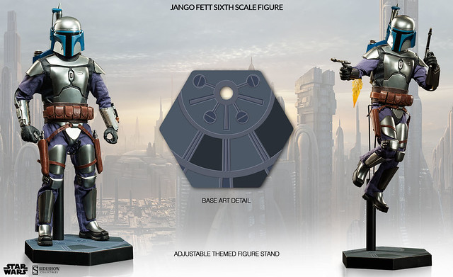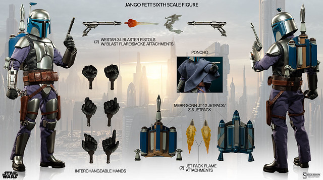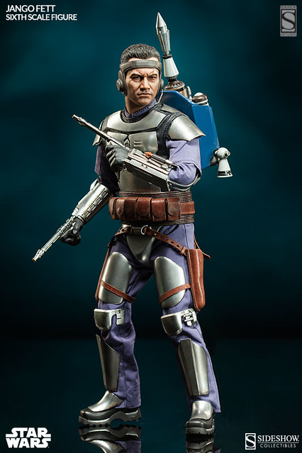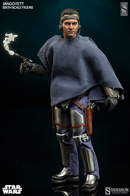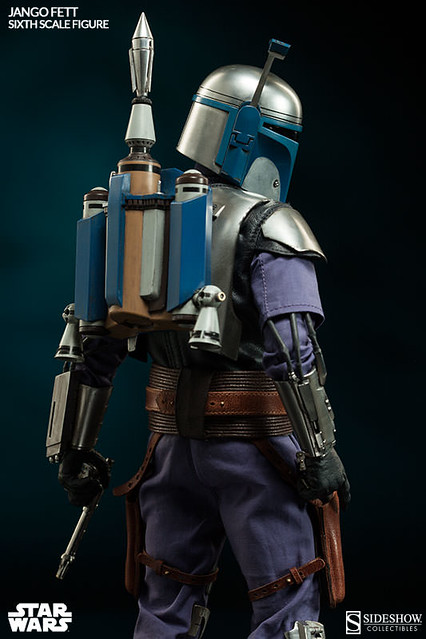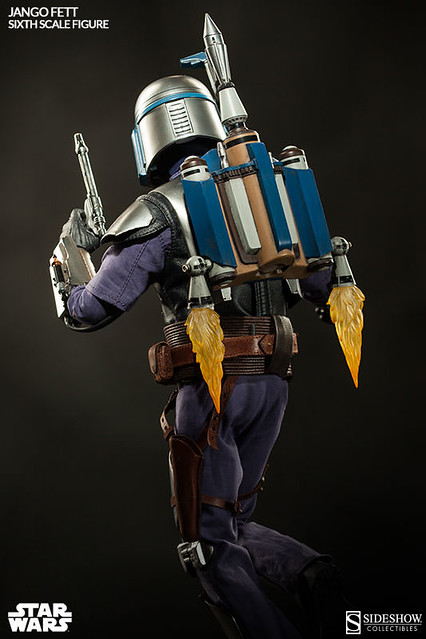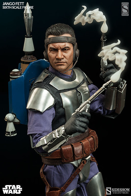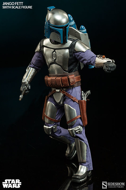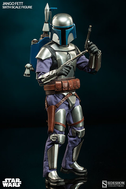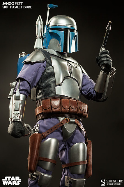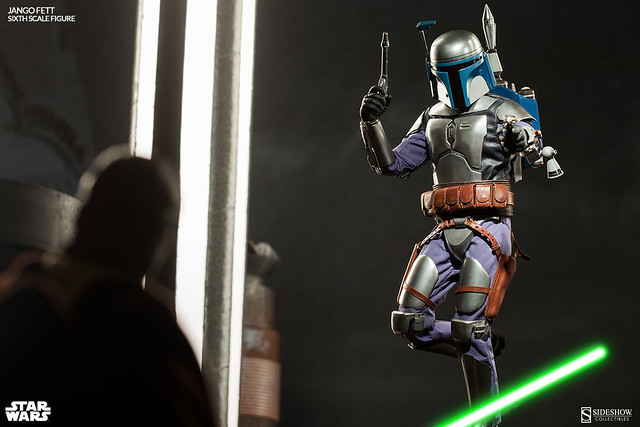 傳奇獵人強格·費特(Jango Fett)是電影「星際大戰二部曲:複製人全面進攻」的關鍵角色。強格·費特提供了DNA生產複製人大軍,同時也誕生了傳奇賞金獵波巴·费特。在電影中狡猾的戰術與各種強大火力武器,讓許多絕地武士都感到蛋疼,但是最後他仍死於雲度大師之手,結束了他傳奇的一生。很高興這次SIDESHOW決定推出這位角色的1/6比例人偶,除了十分傳神的頭雕,雙槍與火箭噴射飛包也很精緻重現了!地台設計成除了站立也能呈現飛行姿態,作為星戰迷看了絕對熱血沸騰啊!本商品售價219.99美元,預購後預計2015年6月出貨,提供給大家參考!