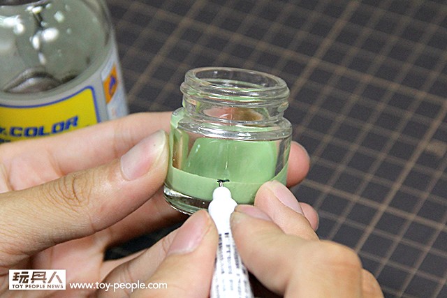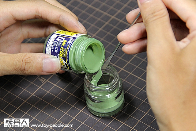 所以為了讓漆料的色彩均勻,而且不是讓你只是在使用有機溶劑。我們就需要利用驚異薩克手中的神兵利器~“調色棒”~來進行攪拌的動作。攪拌的時候,建議各位採用溫柔的低轉速,攪拌大約20~40次。若是碰到比較頑強的漆料,就請先加一點硝基漆用溶劑,並且增加攪拌數,直到不再結塊才可以用喔。
