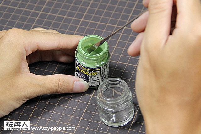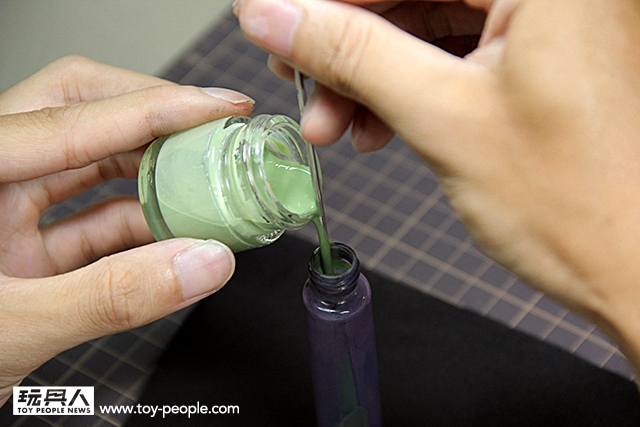 ▼ 接著,就是順著調色棒,把辛苦攪拌好的漆倒入,噴漆罐專用的容器中。