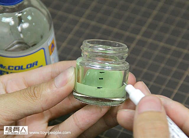 ▼ 下一步,就是幫已經倒入硝基漆原液的空瓶,畫線。透過畫線,可以讓我們知道接下來溶劑需要倒入多少。