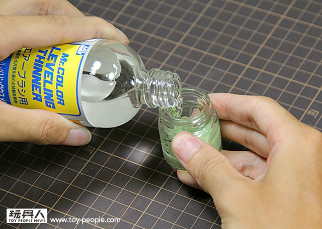 讓原液跟溶劑呈現1:1.5 的狀態。這樣才可以讓漆料呈現可以使用的狀態,不然太濃可是會造成漆面較為粗糙,或是很快就結塊無法使用喔。若是太稀則是會讓著色力變差,同時影響發色。