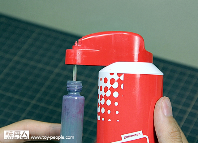 在這邊為各位介紹一下這可調色噴漆罐的來頭。不管是田宮、郡氏或蓋亞,都有出簡易噴筆+氣壓罐的組合,這類型的產品是為了讓噴漆時,能攜帶方便跟節省空間而設計的,同時透過可裝填不同顏色的漆料,讓各位玩家可以有更多顏色可以使用。所以非常適合剛進入噴漆世界玩具人玩家來使用。