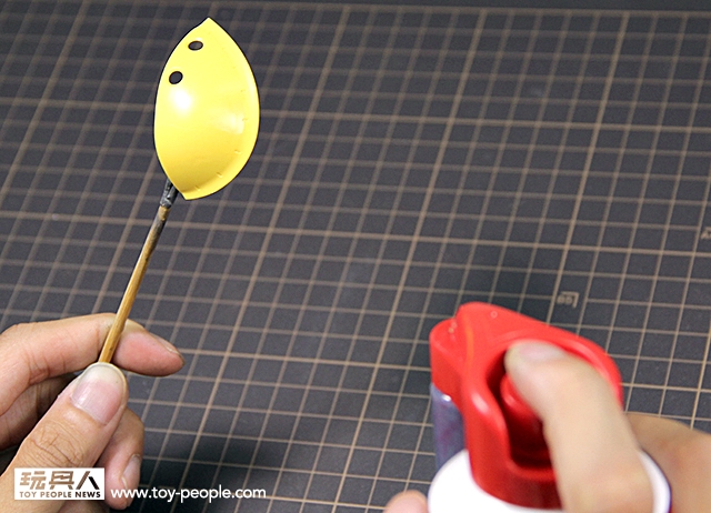 ▼ 完成遮蓋作業之後,就開始上色了。喬老師前面有說過,要距離多遠呢?15~20公分。要怎樣噴呢? 薄噴。同時也別忘了噴漆的好夥伴,使用噴漆夾來固定零件喔!