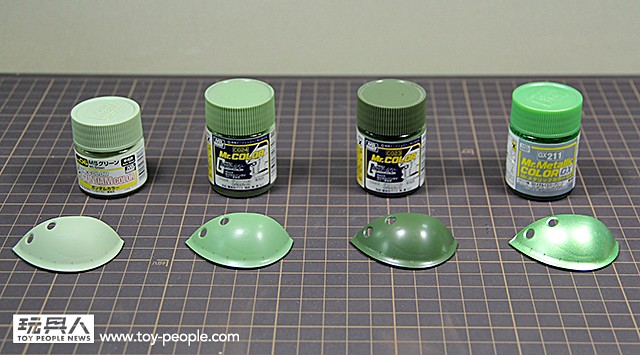 這四款顏色均是郡氏出產的,最左邊的三款是Mr.Color系列的鋼彈專用色系列。分別是UG06半光澤吉翁系淺綠、CG24半光澤薩克綠(4)號、CG23半光澤薩克綠(3)號,最右邊的那款是郡氏Mr.Metallic Color的GX211金屬黃綠。這四種顏色你喜歡那一種呢? 適當的混用跟多色搭配,可以讓你的模型更加精采喔!~