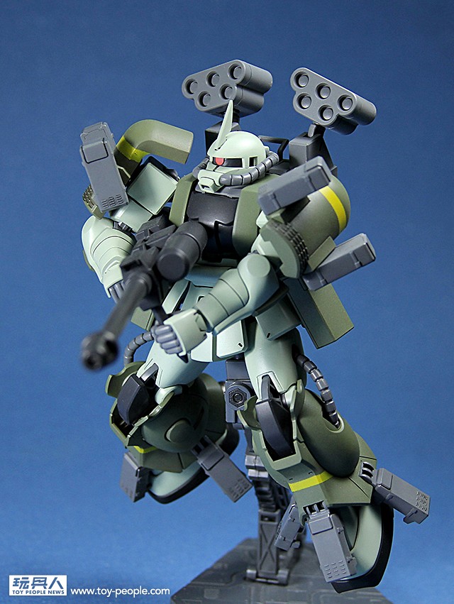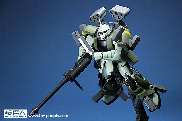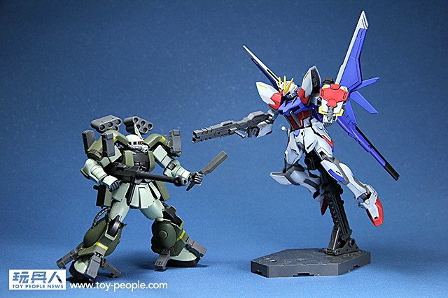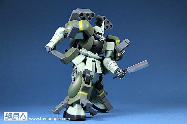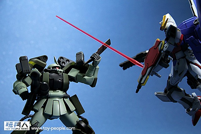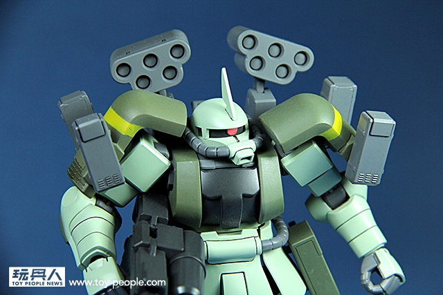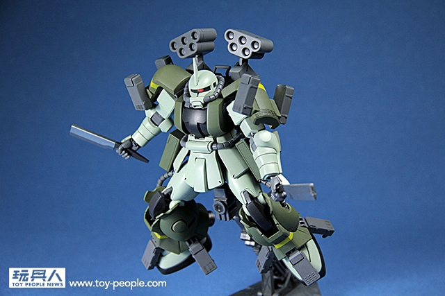 首先是驚異薩克的經典姿態,手持雙刀。俗話說的好,有一對好刀,撂倒主角不是夢。(在鋼彈創鬥者中,驚異薩克的操作者結成達也,可是利用這對熱能刀,就讓主角嚐到戰敗的滋味呢~!)