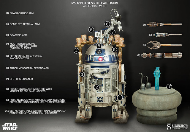 SIDESHOW挑戰最完美的星戰蒐藏!預計今年底將推出超細緻再現的星戰機器人R2-D2(簡稱R2)。R2在電影裡是多功能機器人,除了多種切割、焊接工具外,另外也有通訊、航太導航連接控制等特殊能力。SIDESHOW這次推出,最厲害的地方就是細緻重現了多達10種特殊功能配件(請見下方說明),絕對是星戰迷看到會感動流淚的用心力作。本作品目前野獸國已經開放預購,售價約5000台幣,預計2014年底出貨,提供大家參考喔!
