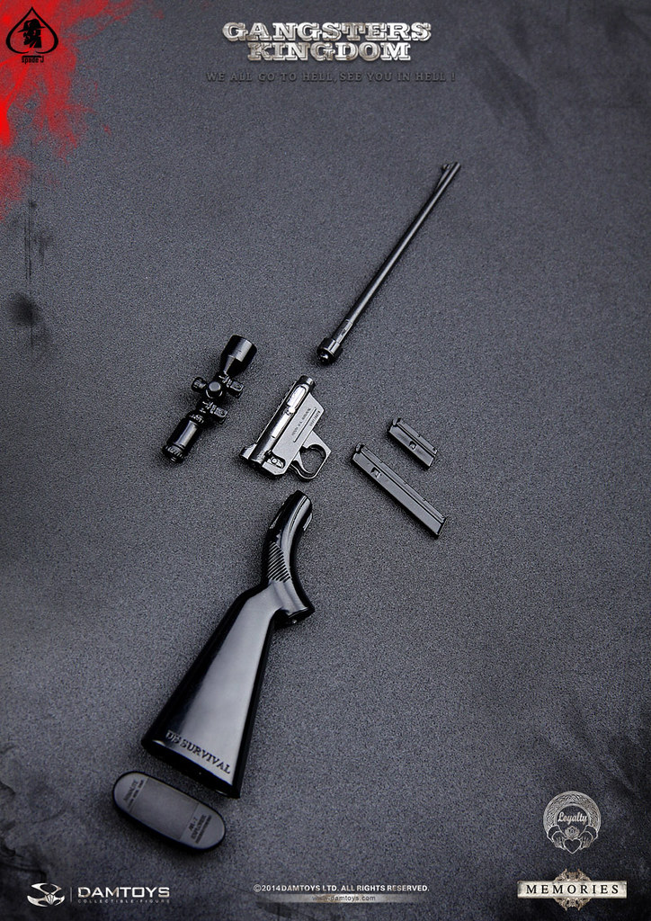 這次的作品,是「黑幫王國」系列作第一位角色“黑桃J (Spade J) ”的回憶篇(Memories Ver.),以黑桃J 成為黑幫成員前的殺手造型製作,有著與先前造型截然不同氣氛的黑色裝束、武裝,其中ar-7狙擊槍具備了複雜的拆卸、收納功能,相當地精緻;而精緻剪裁的黑色皮大衣、西裝也表現的相當棒!