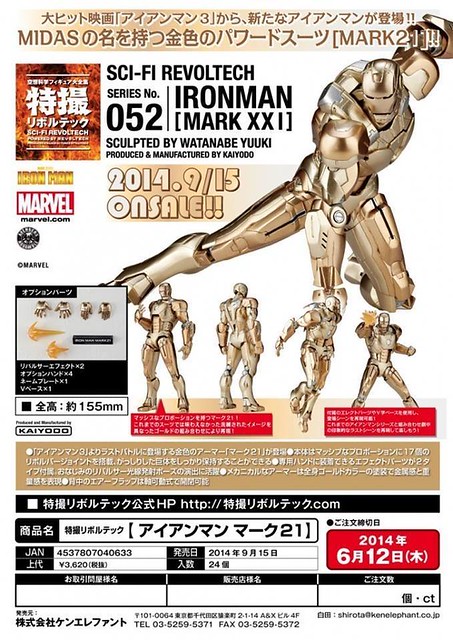 玩具新聞 日系 海洋堂 鋼鐵人 Ironman REVOLTECH 海洋堂 REVOLTECH No.052 IRONMAN3 – Ironman Mark XXI 奶油隊長 2014-05-14 11:40:48 分享 ✕ 分享 已複製網址 分享到 Facebook 分享到 LINE 分享到 Reddit 分享到 Twitter 分享到 Plurk 分享到微博 日海洋堂玩具公司的REVOLTECH 輪轉可動系列預計2014年9月15日發行 REVOLTECH No.052 IRONMAN3 – Ironman Mark XXI 鋼鐵人3 馬克21,在電影鋼鐵人3當中出現短短幾秒的金光閃閃馬克21這次將以REVOLTECH 輪轉可動系列呈現,附可交換手首、噴射特效等等配件,售價約3620元日幣,喜歡鋼鐵人的玩具人可以參考一下歐! >>>點此看更多精彩的『鋼鐵人』玩具新聞與情報 奶油隊長 沈迷收集玩具、嗜好設計玩具、熱愛視覺圖像的思考模式,同時也超愛吃各種口味的美式漢堡,希望可以一直玩玩家到 100 歲。