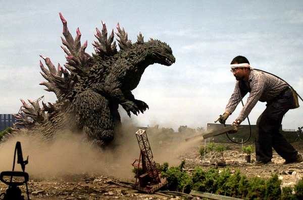 這次《哥吉拉》怪獸氣氛的鋪陳十分用心,從電影才開始半小時,就出現了第一隻怪獸MUTO穆透(台灣翻譯名稱)登場發出EMP電磁脈衝波就弄壞電網後大肆破壞,慢慢接著強大海嘯現身的哥吉拉將與MUTO穆透決一生死,前半段哥吉拉很多畫面都是只露出部分身體或是只有背鰭在海面上,多半時間是神龍見尾不見首,藉由氣氛音效或只是幾秒稍縱即逝的些許影像,增添不少莫名的懸疑感,慢慢將《哥吉拉》將要現身的氣氛一次爆發出來,真讓小編內心的怪獸魂沸騰到最高點啊!在怪獸對決的武打戲中,哥吉拉和MUTO穆透的近身肉搏戰空前激烈,導演將前幾場怪獸的武打戲時間縮的很短,慢慢鋪陳在片尾的三獸混戰場面,哥吉拉基本上用嘴巴咬、用尾巴甩,加入有點像摔角動作一樣的戰鬥畫面,接著當哥吉拉的身體前緣和背棘發光的時候,想必怪獸迷們都知道接下來哥吉拉將會使出必殺激光噴射,真令人相當興奮莫名啊!