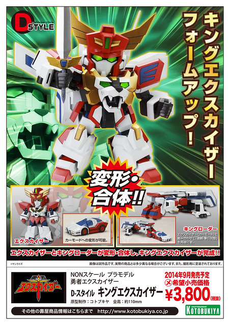日壽屋玩具公司的D-Style系列預計在2014年9月推出D-スタイル 勇者エクスカイザー キングエクスカイザー プラモデル(組裝模型),勇者エクスカイザー 勇者艾克斯凱撒(暫時翻譯),為Sunrise勇者王動畫系列作品之一,日本朝日電視台播放的勇者王系列動畫之一,以壽屋玩具公司的D-Style系列呈現勇者艾克斯凱撒,有附多款車輛、拖車等等機體,武器配件附有凱撒手裡飛鏢等、凱撒劍戟有劍出鞘狀態和存儲兩種狀態,組裝完成尺寸高約11公分,參考售價約3,800元日幣,提供給喜歡勇者王系列的玩具人參考。