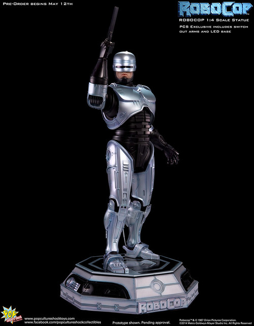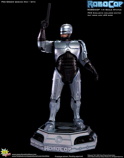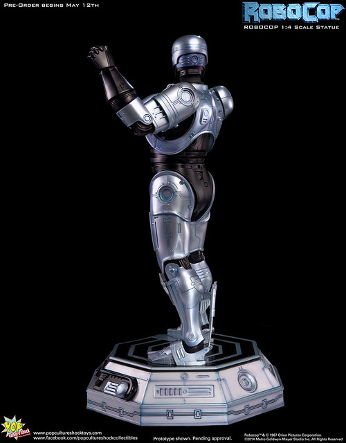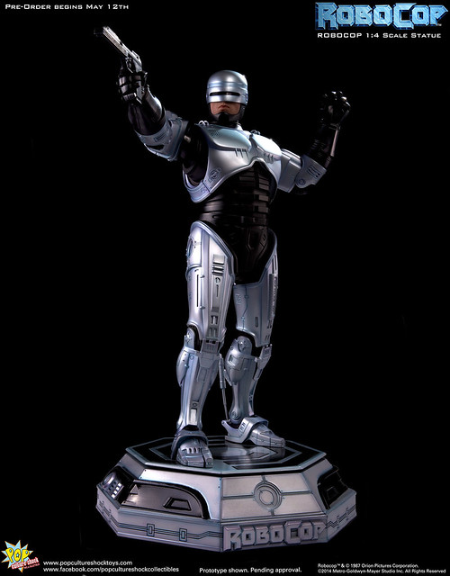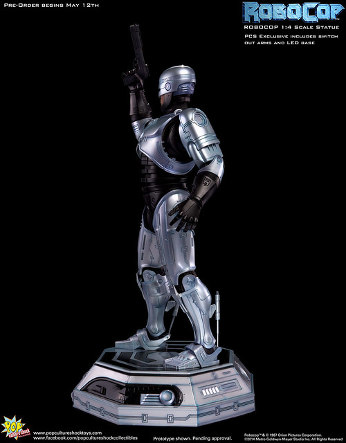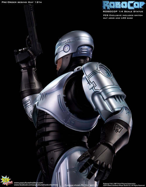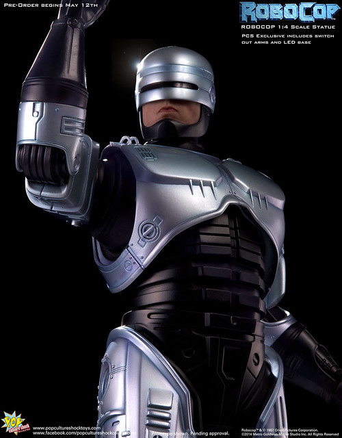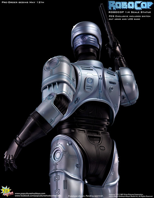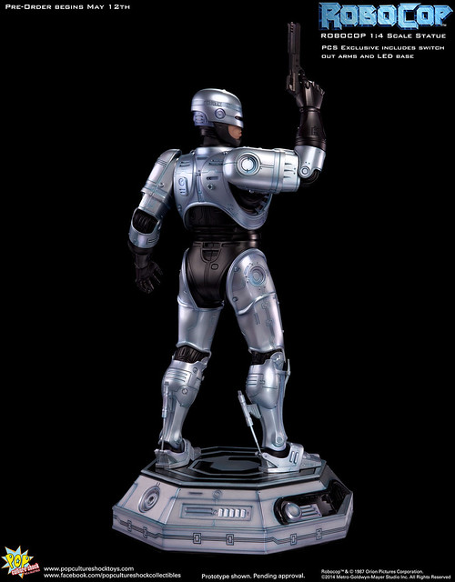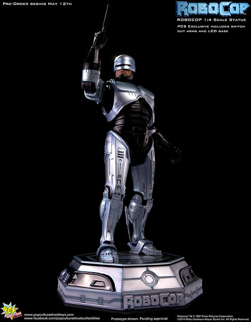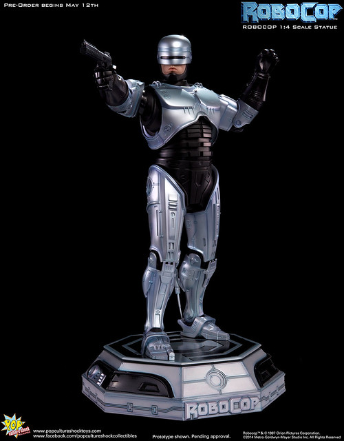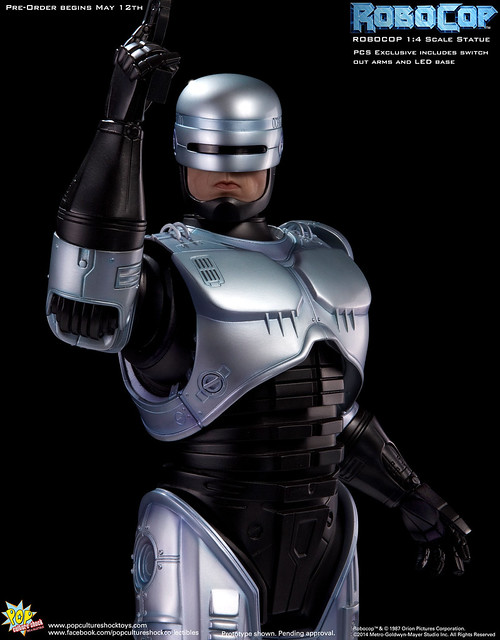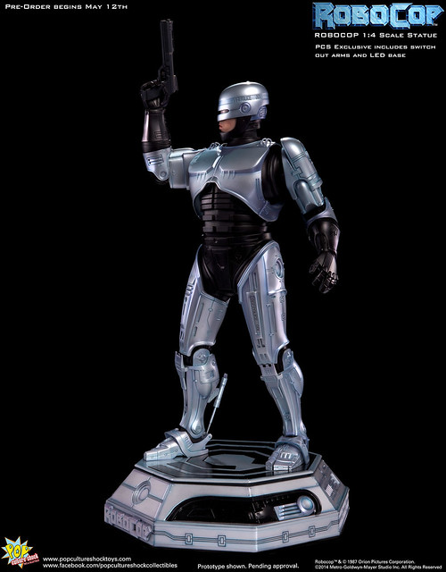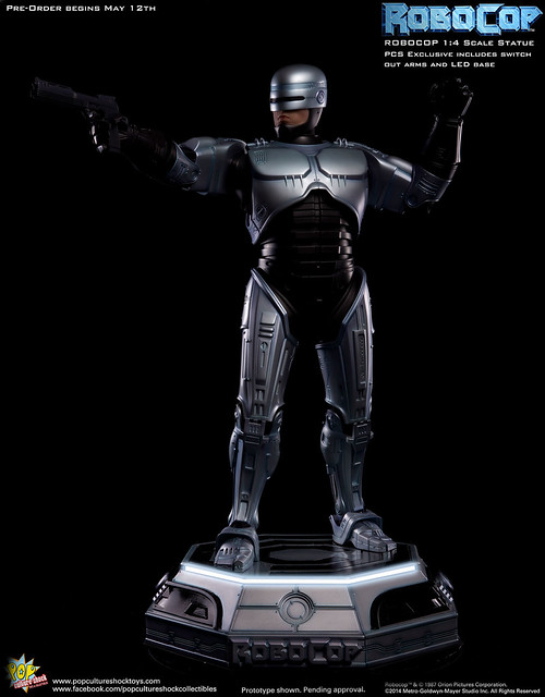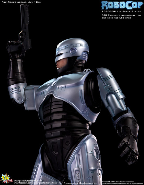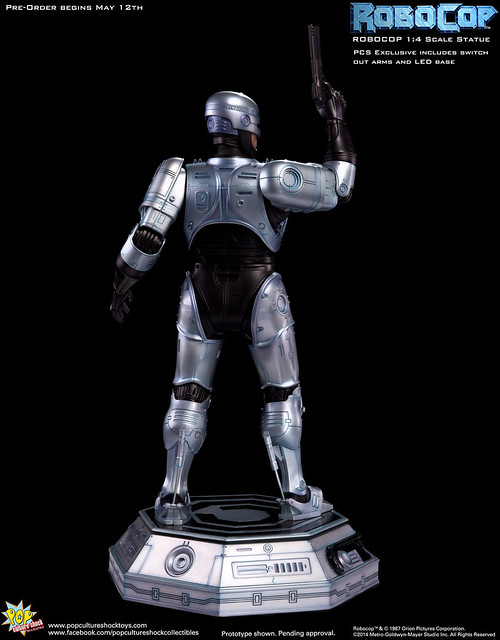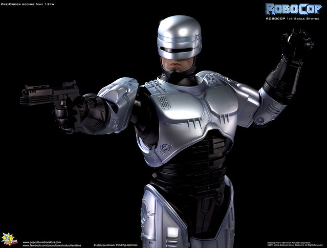 Pop Culture Shock新作機器戰警1/4比例雕像預購展開!相較HOT TOYS與ENTERBAY的版本,小編認為最值得比較的是金屬材質的表現,畢竟這是本角色最大的特色之一。本作品的金屬身軀可以看到有作些微的藍色塗裝,讓機械結構看起來更有科技感。另外地台也頗細緻。本作品分為限定版與一般版兩種,限定版售價449美元,限量350尊,比一般版多了彎曲的右臂可供替換以即可發光地台。有興趣的朋友不妨跟HOT TOYS與ENTERBAY的版本比較後再入手喔!預計2015年第2季推出,提供大家參考!