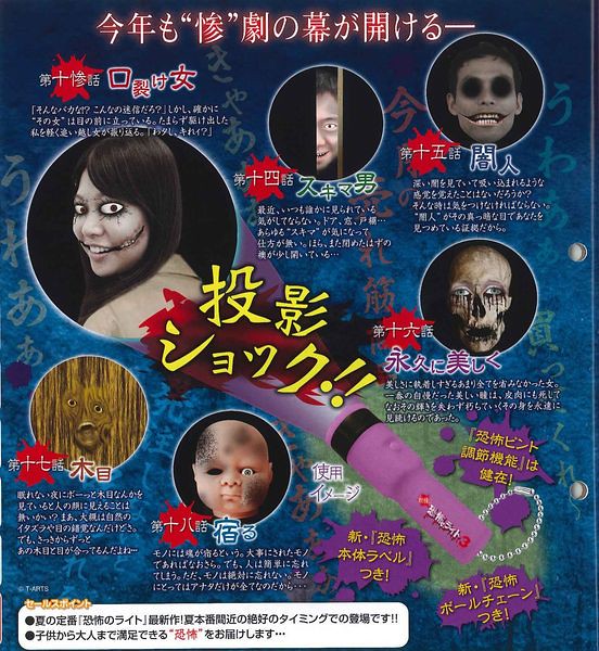 日本老愛在暑假推出恐怖系列商品。這次TAKARA TOMY也預計在6月推出大人氣惡作劇轉蛋商品「恐怖投影(恐怖ライト)」第3彈。承襲前作以鬼故事的方式命名,分別推出「第十惨話 口裂け女」、「第十四話 スキマ男」、「第十五話 闇人」、「第十六話 木目」、「第十七話 永久に美しく」、「第十八話 宿る」共六款!炎炎夏日只要200日圓就讓您朋友背後陣陣涼意,敬請期待啊!