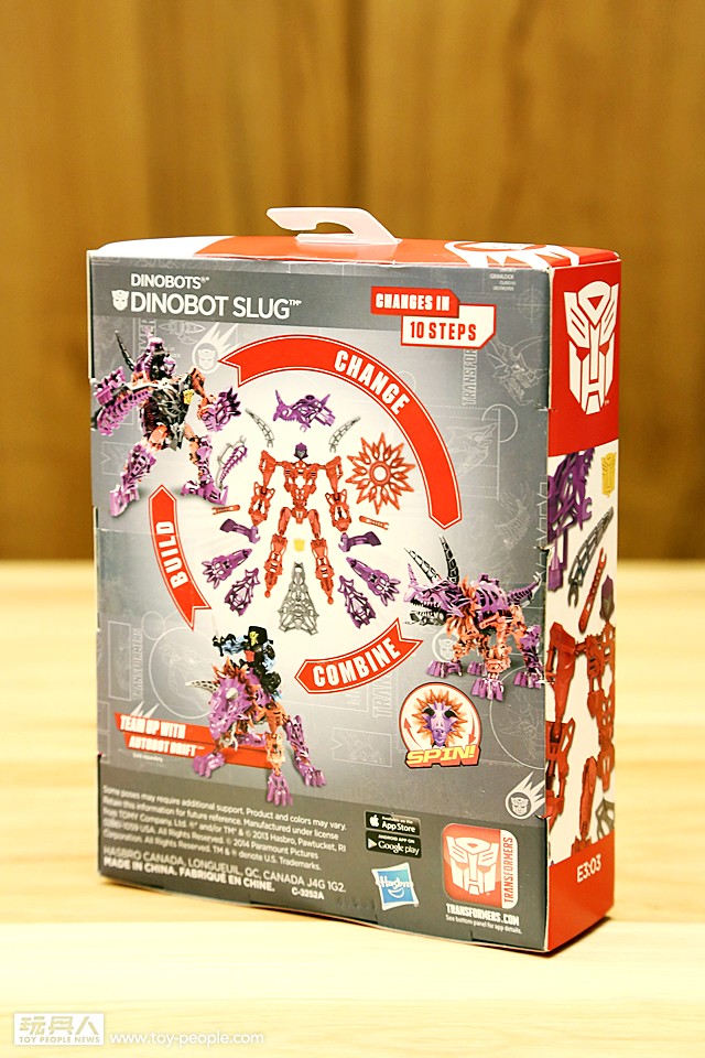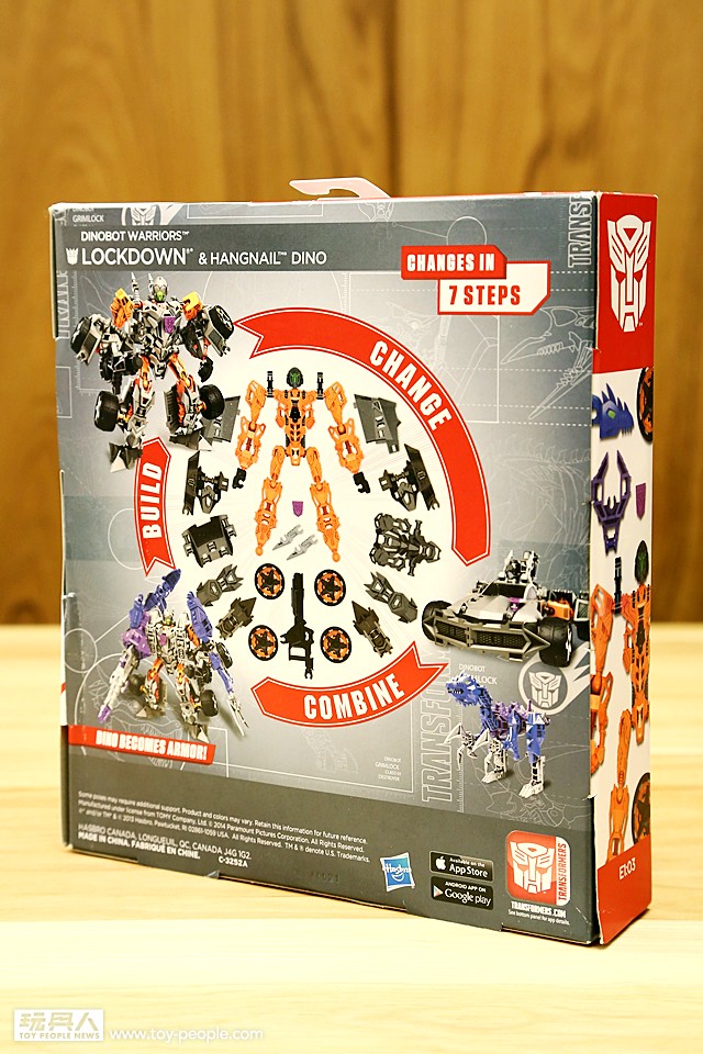 ▼ 包裝背面。這裡介紹了建構、變形之外,還能讓這個基本組的角色騎乘於恐龍金剛組之上!重現電影中柯博文騎在鋼鎖背上的帥氣畫面~