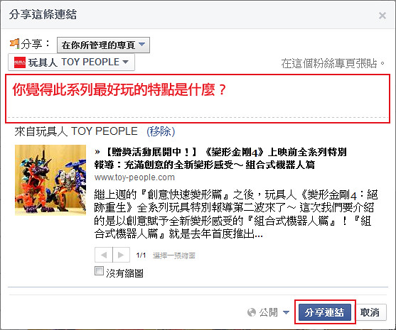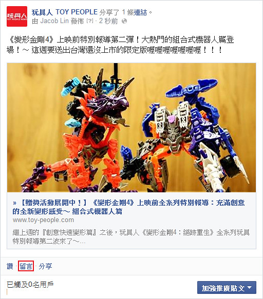 1. 到本次的「《變形金剛4》上映前全系列特別報導:充滿創意的全新變形感受~ 組合式機器人篇」專題報導按“讚”,並分享至你的塗鴉牆上,分享時寫下你覺得“此系列最好玩的特點是什麼?” 只寫“已分享”是鐵定不會中獎的喔!