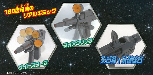 這一款以「機動戰士鋼彈」的兩款經典武器作為設計的水槍,採用約1/29 的比例製作,並具備了重現原作的可調整是瞄準鏡、握把...等。TX-78-2 光束步槍全長約31公分,薩克機槍約36公分,射擊距離約5公尺,這可說是鋼彈迷們相當值得入手的有趣作品喔!推薦給各位喜愛「機動戰士鋼彈」的玩具人!:D