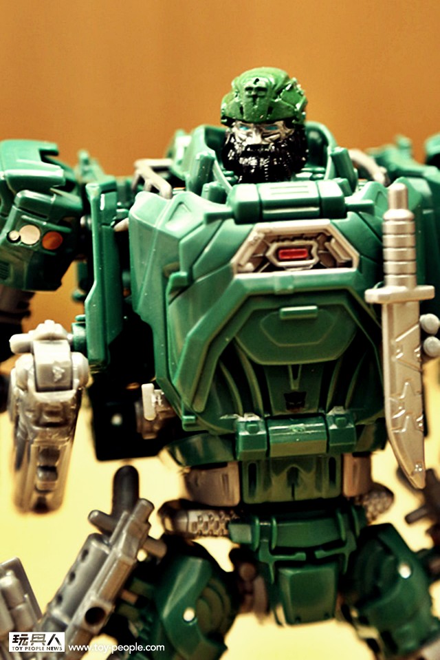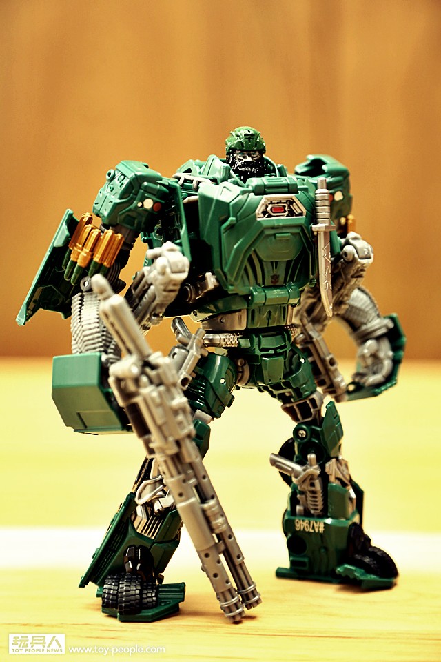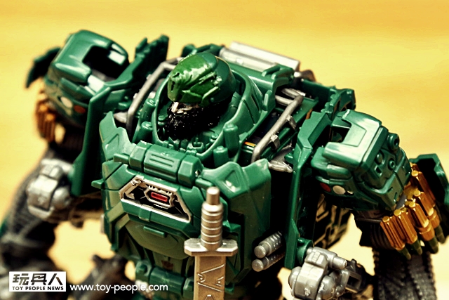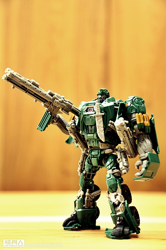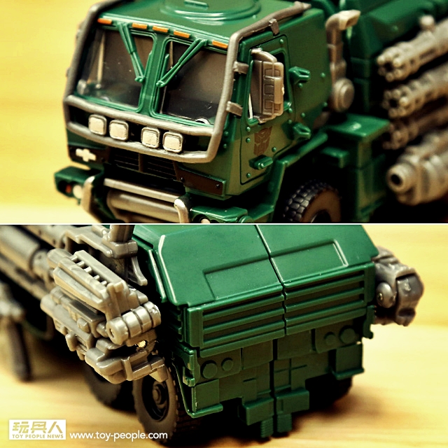 ▼ “探長”(Hound)的原型是“豪士科中型戰術卡車”(Oshkosh Defense Medium Tactical Vehicle)所以具備了大量的軍事元素,造型上對於這些細節刻畫的相當精采!彈鍊變形的手臂、臂膀上有著大口徑砲彈裝飾、8隻武器全都能收納於身上...等,讓“探長”(Hound) 看起來就像是一個火力十足的移動軍火庫!超殺!