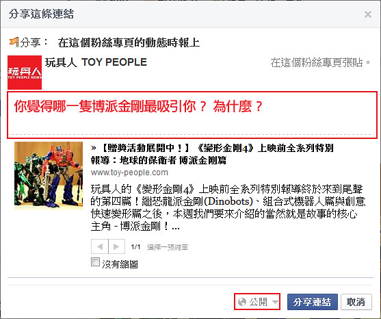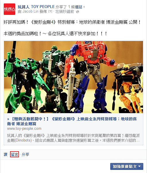1. 到本次的「《變形金剛4》上映前全系列特別報導:地球的保衛者 博派金剛篇」專題報導按“讚”,並分享至你的塗鴉牆上,分享時寫下你覺得“覺得哪一隻博派金剛最吸引你? 為什麼?” 只寫“已分享”是鐵定不會中獎的喔!
