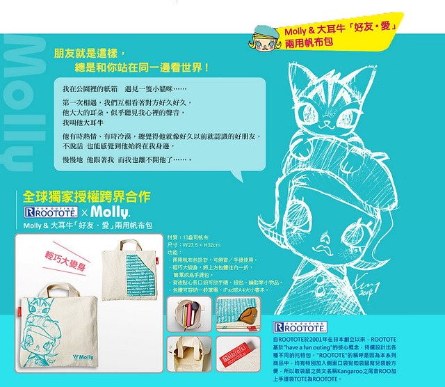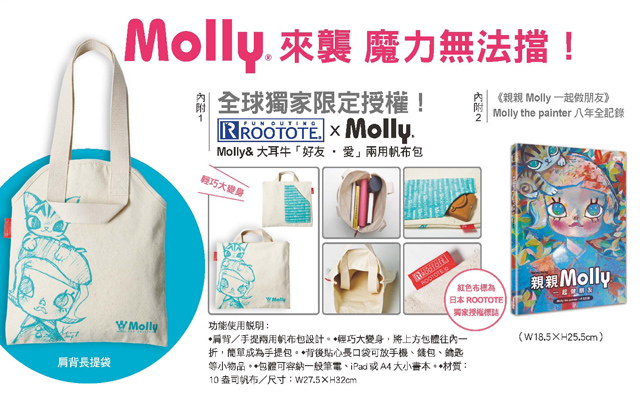 這次的合作,是由Kenny、日本知名品牌ROOTOTE 與三采文化三方共同跨界合作,《親親Molly:一起做朋友》本書將收錄當紅角色Molly 的身世秘辛,以及收錄了歷年來Molly 各項跨界合作成果、Molly不同時期設計主題...等,是全球首款Molly 主題的概念書。